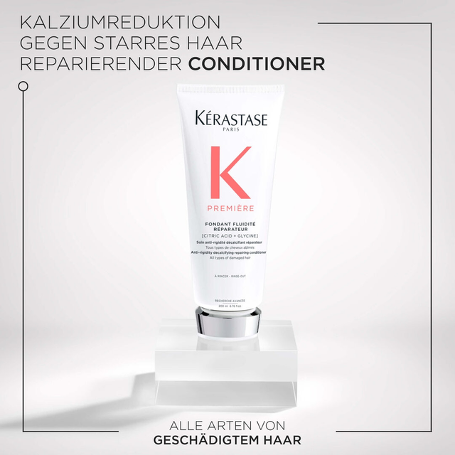 Der Conditioner Fondant Fluidité Réparateur ist eine Repair-Pflege mit Anti-Kalzium-Wirkung gegen steifes Haar für alle Typen von strapaziertem Haar. Es entfernt die für Haarbruch verantwortliche Überdosis Kalzium von der Haaroberfläche und aus dem Haarinneren und stellt die inneren Brücken der Haarfaser wieder her*. Es umhüllt das Haar sanft, spendet Feuchtigkeit und kräftigt es, während es gleichzeitig für fließenderes, geschmeidigeres Haar sorgt.