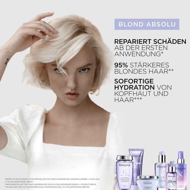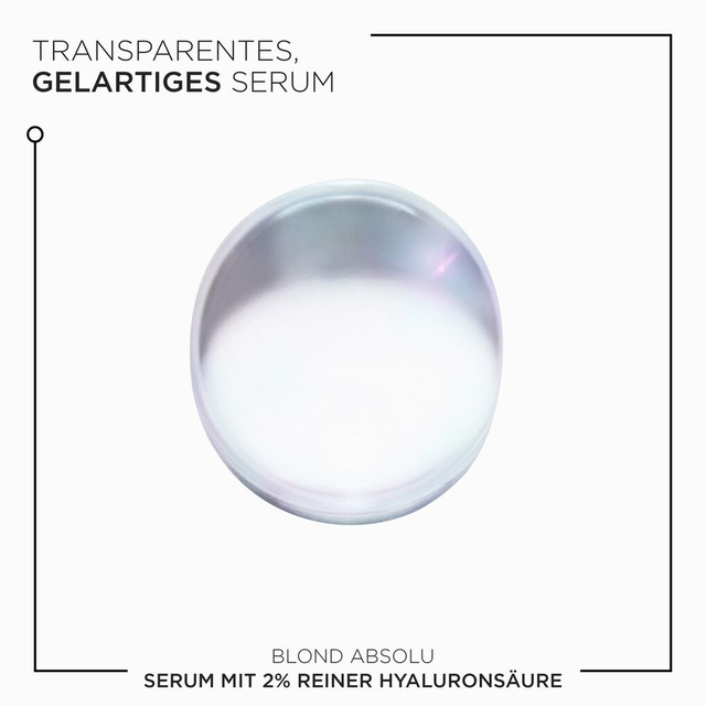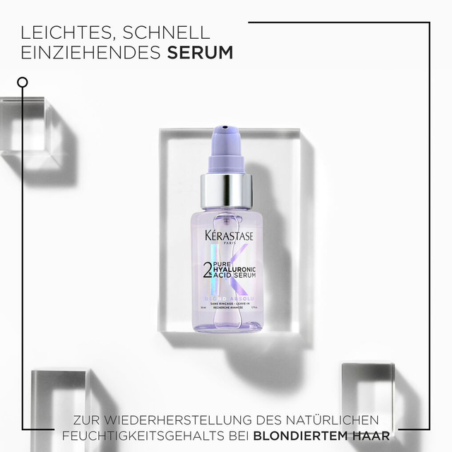 Feuchtigkeitsspendendes Pflegeserum, jetzt für das Haar. Das neue Serum 2% Hyaluronsäure pur aus der Produktlinie Blond Absolu von Kérastase ist ein feuchtigkeitsspendendes und reparierendes Serum für blondes Haar sowie für empfindliche Kopfhaut. Es ist für blondiertes Haar gedacht, da es Hyaluronsäure enthält - mit unserer höchsten Konzentration an Makro- und Mikrohyaluronsäure, die oberflächliche Haarschäden repariert und Kopfhaut und Haar mit Feuchtigkeit versorgt.